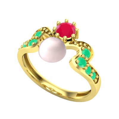 Pembe inci, kök yakut ve kök zümrüt 8 ayar altın yüzük