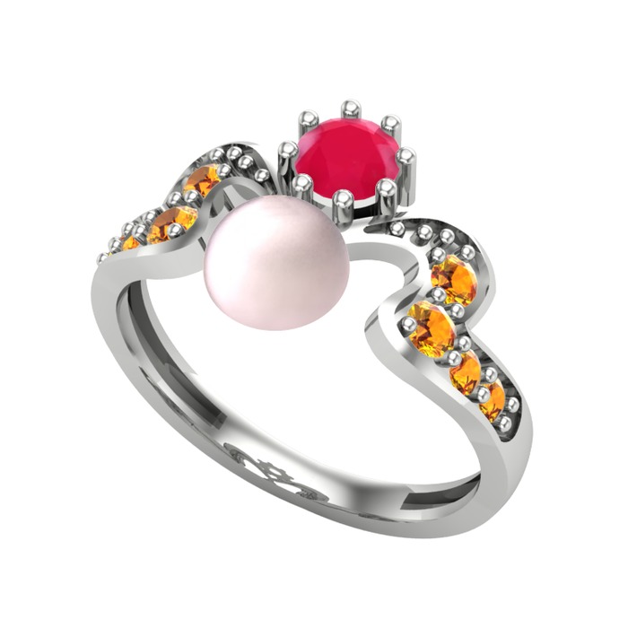 Pembe inci, kök yakut ve sitrin 14 ayar beyaz altın yüzük
