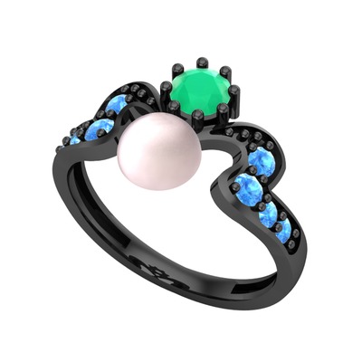 Pembe inci, kök zümrüt ve akuamarin 925 ayar siyah rodyum kaplama gümüş yüzük