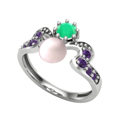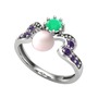 Pembe inci, kök zümrüt ve ametist 8 ayar beyaz altın yüzük