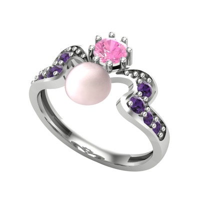 Pembe inci, pembe kuvars ve ametist 8 ayar beyaz altın yüzük