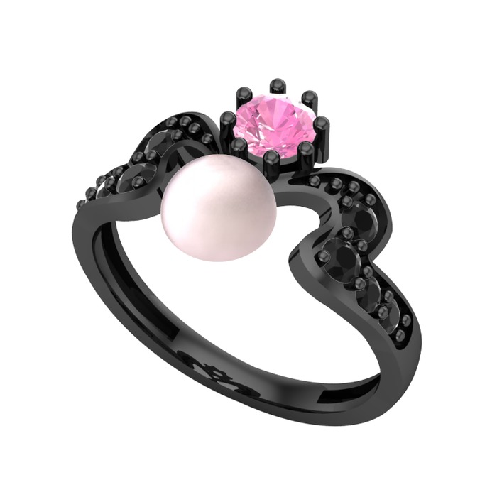 Pembe inci, pembe kuvars ve siyah zirkon 925 ayar siyah rodyum kaplama gümüş yüzük