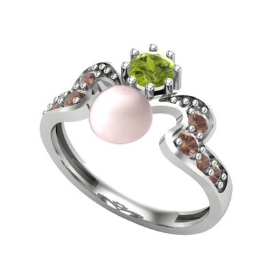 Pembe inci, peridot ve dumanlı kuvars 18 ayar beyaz altın yüzük