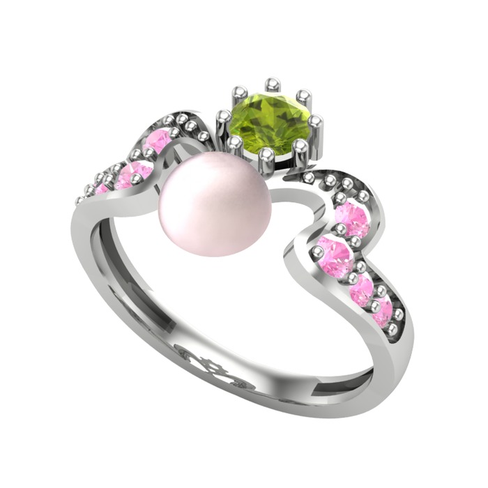 Pembe inci, peridot ve pembe kuvars 14 ayar beyaz altın yüzük
