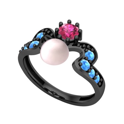 Pembe inci, rodolit garnet ve akuamarin 925 ayar siyah rodyum kaplama gümüş yüzük