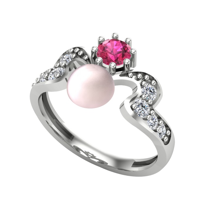 Pembe inci, rodolit garnet ve beyaz zirkon 8 ayar beyaz altın yüzük