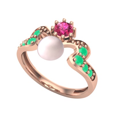Pembe inci, rodolit garnet ve kök zümrüt 18 ayar rose altın yüzük