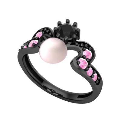 Pembe inci, siyah zirkon ve pembe kuvars 925 ayar siyah rodyum kaplama gümüş yüzük