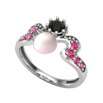 Pembe inci, siyah zirkon ve rodolit garnet 18 ayar beyaz altın yüzük