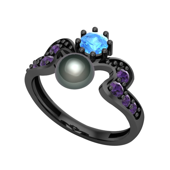 Siyah inci, akuamarin ve ametist 925 ayar siyah rodyum kaplama gümüş yüzük