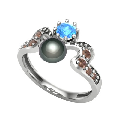 Siyah inci, akuamarin ve dumanlı kuvars 14 ayar beyaz altın yüzük
