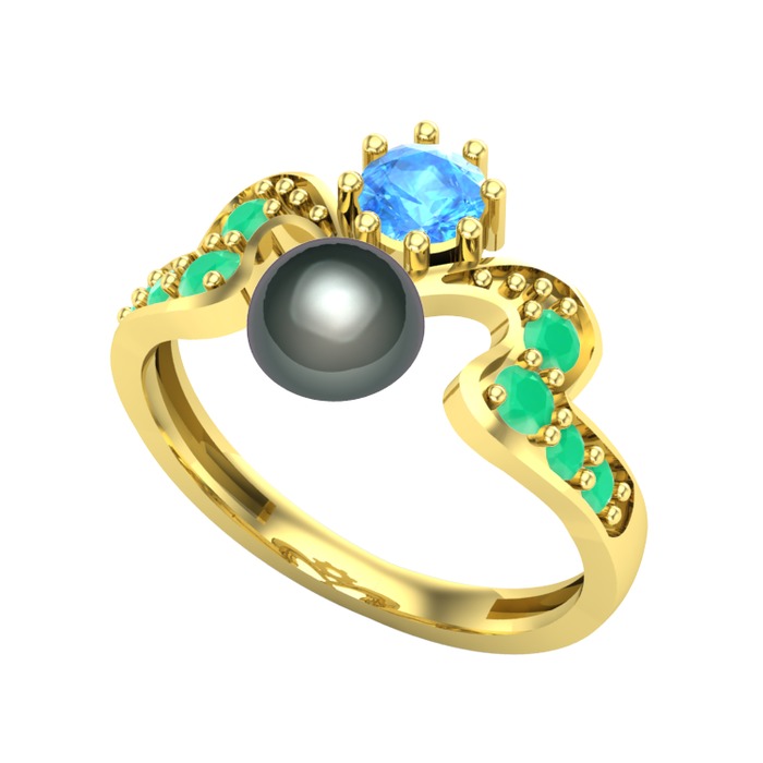 Siyah inci, akuamarin ve kök zümrüt 18 ayar altın yüzük
