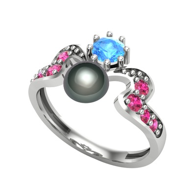 Siyah inci, akuamarin ve rodolit garnet 14 ayar beyaz altın yüzük