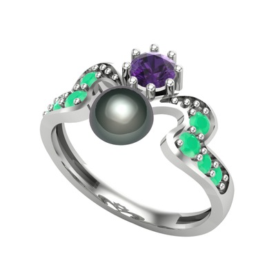 Siyah inci, ametist ve kök zümrüt 8 ayar beyaz altın yüzük