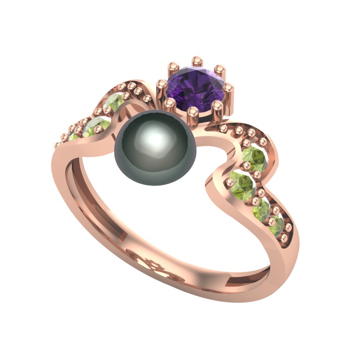 Siyah inci, ametist ve peridot 8 ayar rose altın yüzük