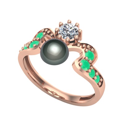 Siyah inci, beyaz zirkon ve kök zümrüt 18 ayar rose altın yüzük
