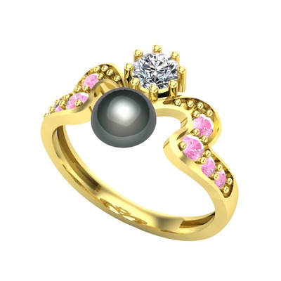 Siyah inci, beyaz zirkon ve pembe kuvars 18 ayar altın yüzük