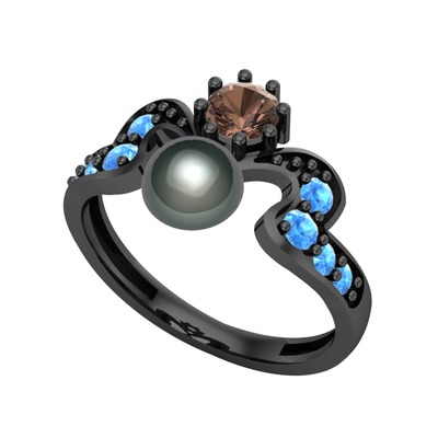 Siyah inci, dumanlı kuvars ve akuamarin 925 ayar siyah rodyum kaplama gümüş yüzük
