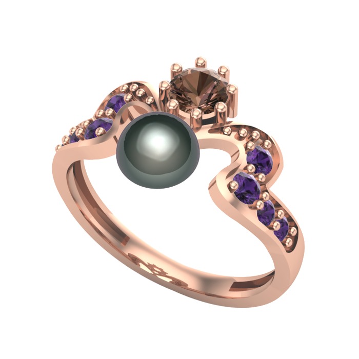 Siyah inci, dumanlı kuvars ve ametist 14 ayar rose altın yüzük