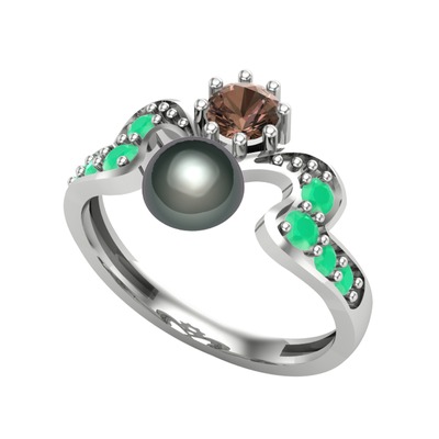 Siyah inci, dumanlı kuvars ve kök zümrüt 8 ayar beyaz altın yüzük