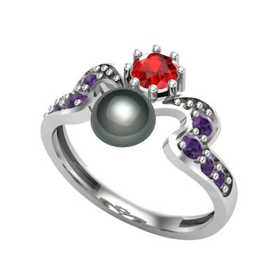 Siyah inci, garnet ve ametist 14 ayar beyaz altın yüzük