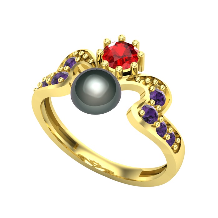 Siyah inci, garnet ve ametist 8 ayar altın yüzük