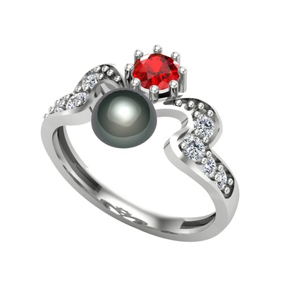Siyah inci, garnet ve beyaz zirkon 8 ayar beyaz altın yüzük
