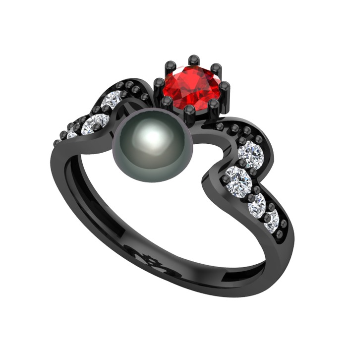 Siyah inci, garnet ve beyaz zirkon 925 ayar siyah rodyum kaplama gümüş yüzük
