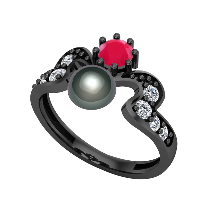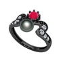 Siyah inci, kök yakut ve beyaz zirkon 925 ayar siyah rodyum kaplama gümüş yüzük