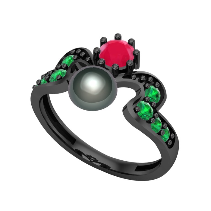 Siyah inci, kök yakut ve yeşil kuvars 925 ayar siyah rodyum kaplama gümüş yüzük