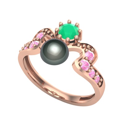 Siyah inci, kök zümrüt ve pembe kuvars 925 ayar rose altın kaplama gümüş yüzük