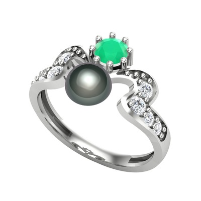 Siyah inci, kök zümrüt ve pırlanta 14 ayar beyaz altın yüzük (0.48 karat)