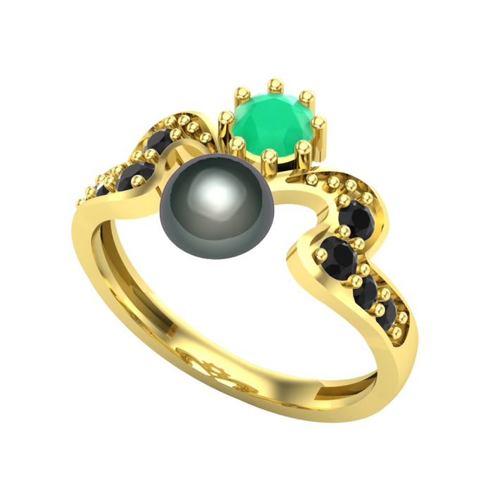 Siyah inci, kök zümrüt ve siyah zirkon 18 ayar altın yüzük