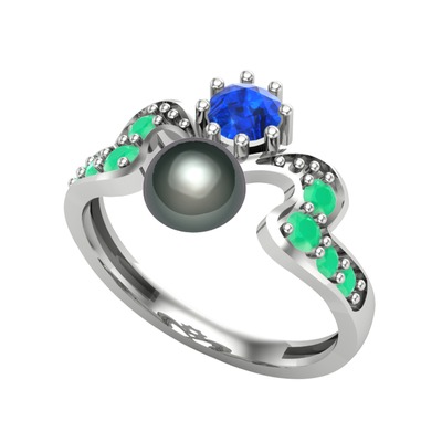 Siyah inci, lab safir ve kök zümrüt 8 ayar beyaz altın yüzük