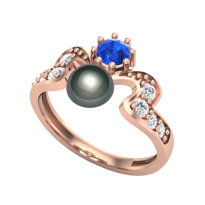 Siyah inci, lab safir ve pırlanta 18 ayar rose altın yüzük (0.48 karat)
