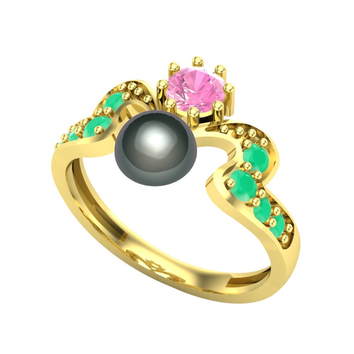 Siyah inci, pembe kuvars ve kök zümrüt 14 ayar altın yüzük