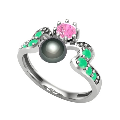 Siyah inci, pembe kuvars ve kök zümrüt 8 ayar beyaz altın yüzük