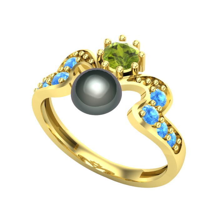 Siyah inci, peridot ve akuamarin 18 ayar altın yüzük