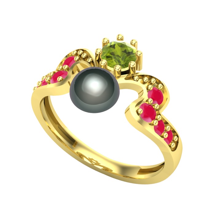 Siyah inci, peridot ve kök yakut 18 ayar altın yüzük