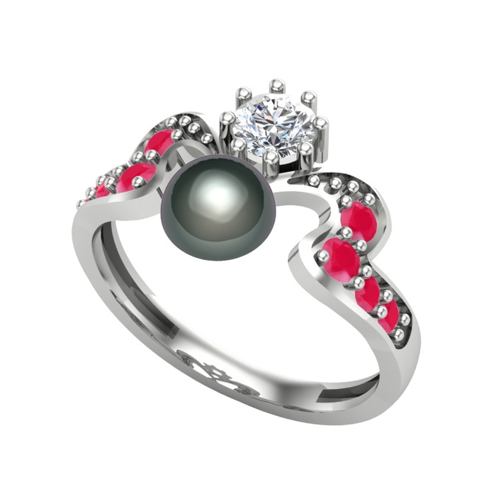 Siyah inci, pırlanta ve kök yakut 18 ayar beyaz altın yüzük (0.35 karat)