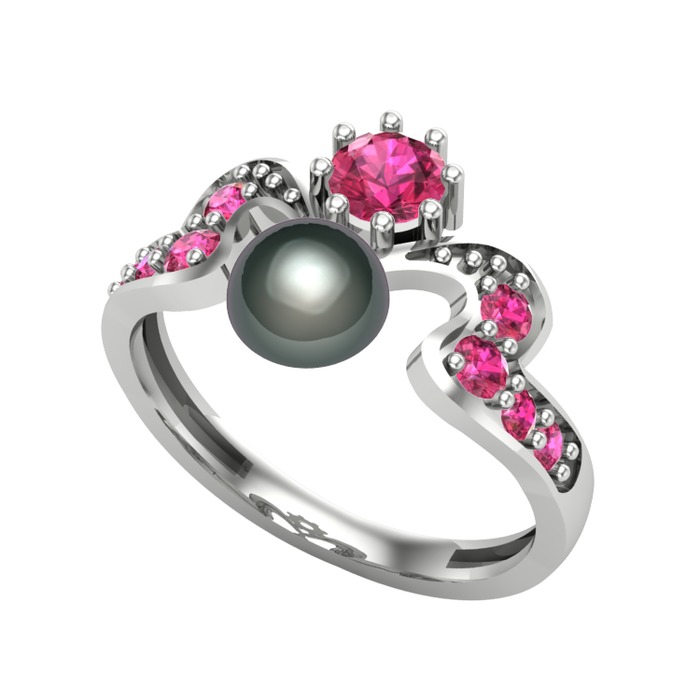 Siyah inci ve rodolit garnet 14 ayar beyaz altın yüzük