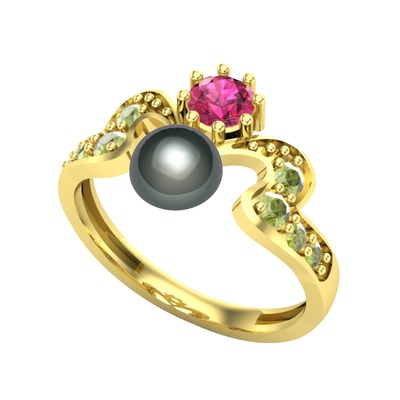 Siyah inci, rodolit garnet ve peridot 18 ayar altın yüzük