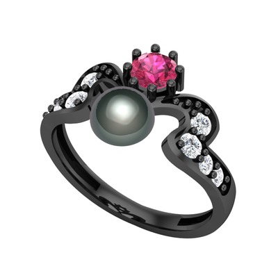 Siyah inci, rodolit garnet ve pırlanta 925 ayar siyah rodyum kaplama gümüş yüzük (0.48 karat)
