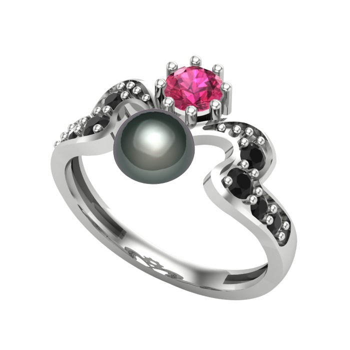 Siyah inci, rodolit garnet ve siyah zirkon 925 ayar gümüş yüzük