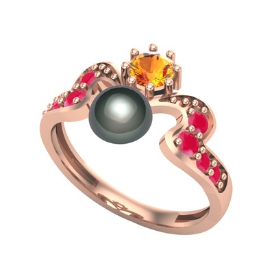 Siyah inci, sitrin ve kök yakut 925 ayar rose altın kaplama gümüş yüzük
