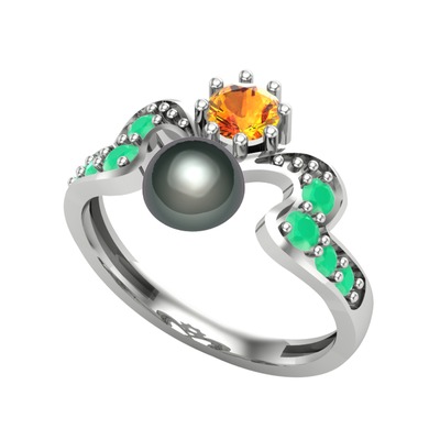Siyah inci, sitrin ve kök zümrüt 18 ayar beyaz altın yüzük