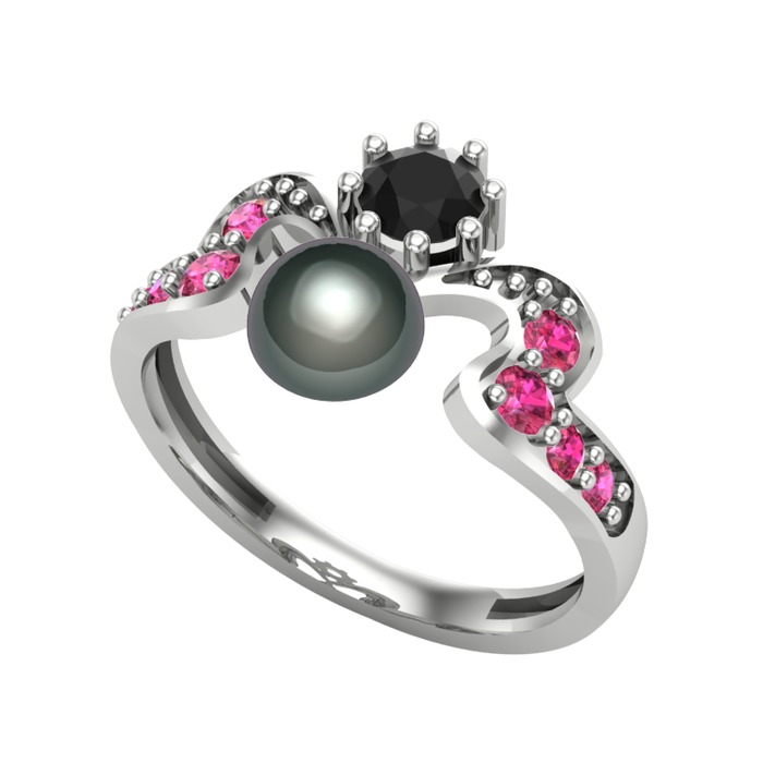 Siyah inci, siyah zirkon ve rodolit garnet 14 ayar beyaz altın yüzük
