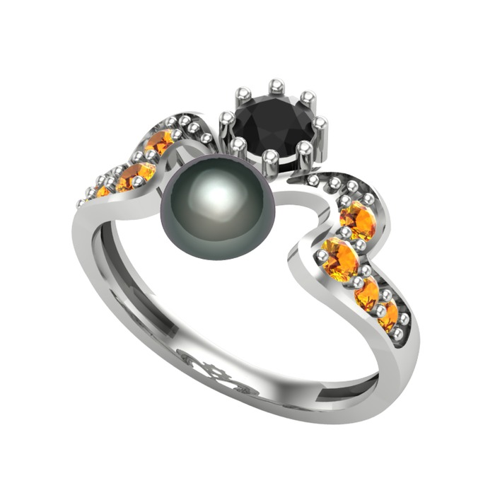 Siyah inci, siyah zirkon ve sitrin 18 ayar beyaz altın yüzük