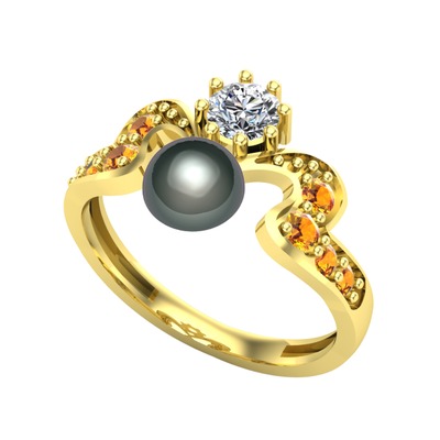Siyah inci, swarovski ve sitrin 14 ayar altın yüzük