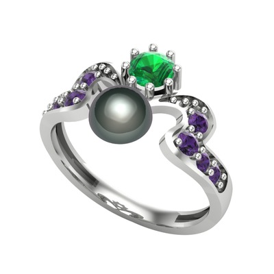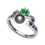 Siyah inci, yeşil kuvars ve ametist 18 ayar beyaz altın yüzük